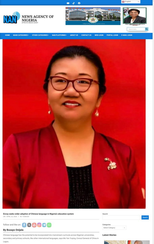 2026年4月20日,第17个联合国中文日来临之际,驻拉各斯总领事严宇清接受尼日利亚通讯社专访。4月22日,尼通社刊载采访。全文如下: